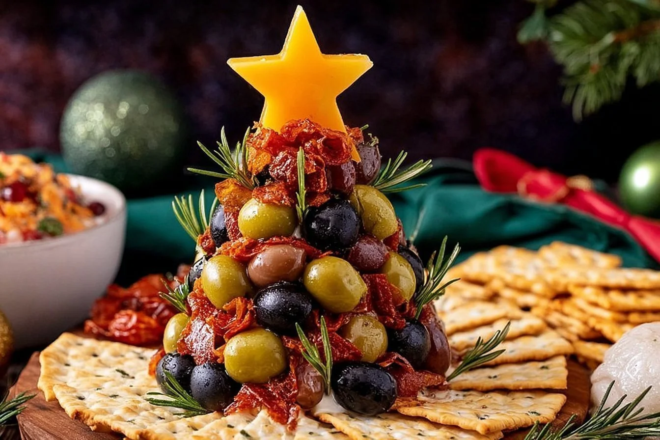 - Press the halved olives and chopped sundried tomatoes into the sides of the cheeseball tree until fully covered.