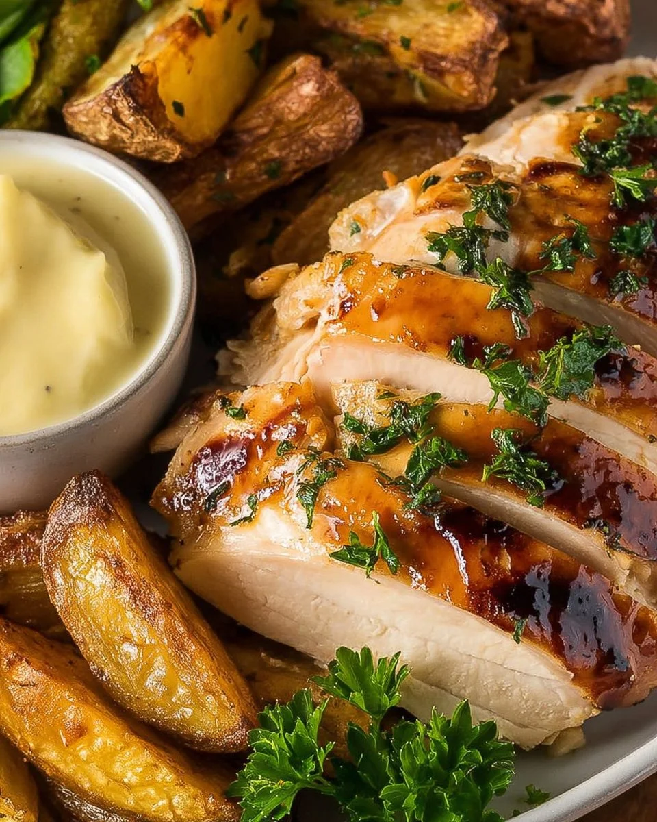 Elevate your roasted turkey breast presentation by serving it with fresh cranberry sauce, sautéed green beans, or a classic stuffing. You can add a seasonal salad with mixed greens for a refreshing complement to your meal. For an added twist, consider serving with a tangy mustard sauce or a homemade chimichurri that brightens the flavors beautifully.