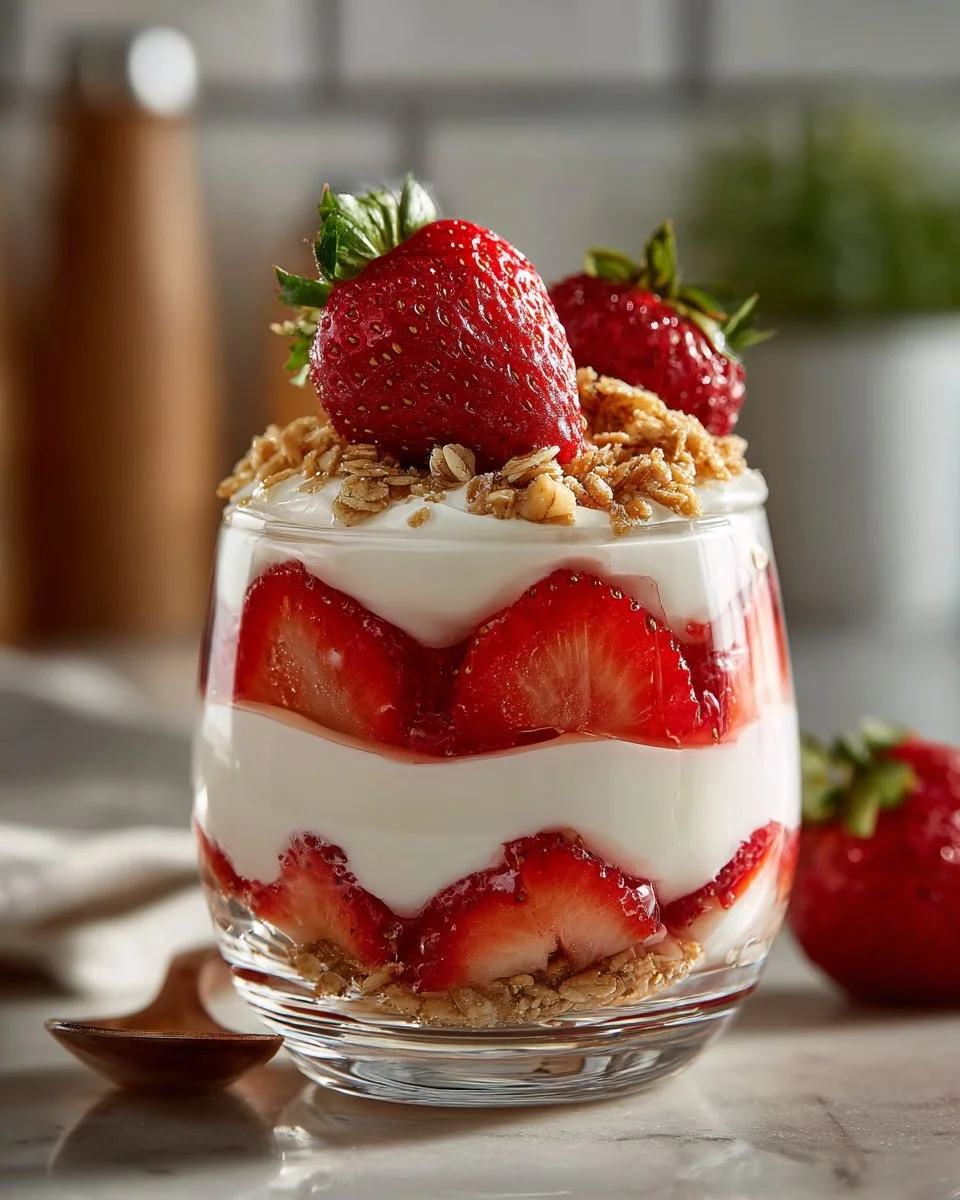 A delightful parfait featuring layers of fresh strawberries, tangy rhubarb, and fluffy coconut cream, making it a perfect comforting dessert.